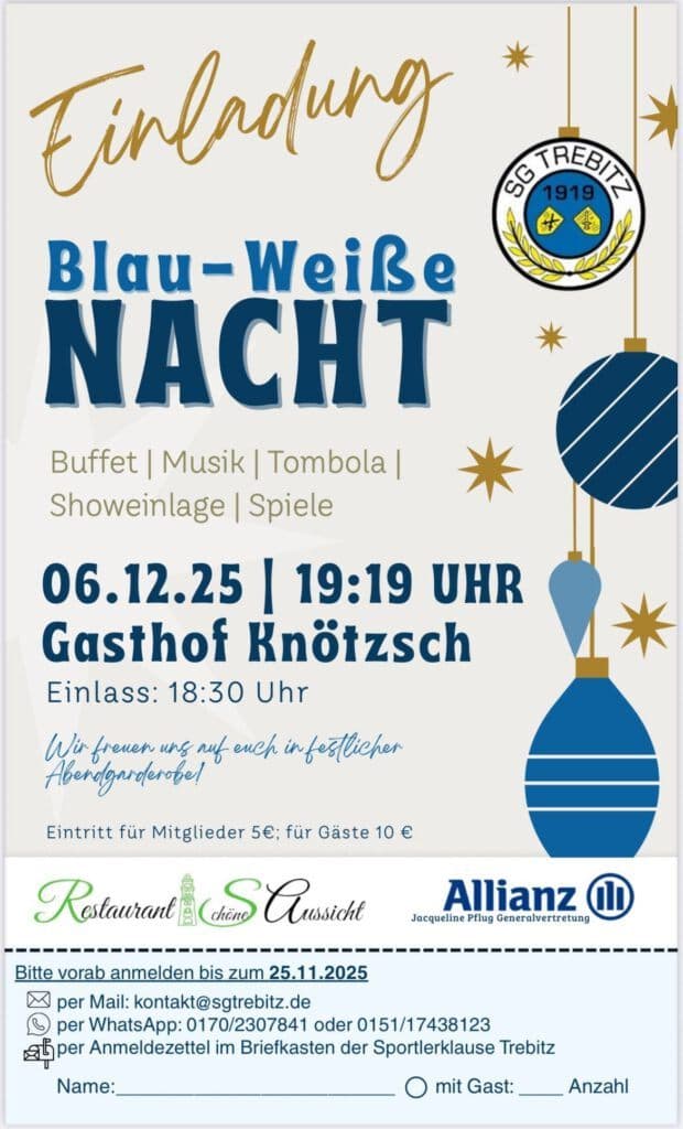 Auch in diesem Jahr möchten wir herzlichst unsere Mitglieder, Fans, Sponsoren und Freunde des Vereins zur Blau-Weißen Nacht einladen.